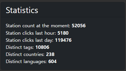 미친자님의 댓글 미친자쪽지보내기 회원정보 게시글 검색 댓글 검색쪽지보내기 회원정보 게시글 검색 댓글 검색 작성일 2025.09.28 14:25 https://www.radio-browser.info/search?page=1&order=clickcount&reverse=true&hidebroken=true&language=korean 바로가기로 하면 한국 라디오로 되네요 신고 https://www.radio-browser.info/search?page=1&order=clickcount&reverse=true&hidebroken=true&language=korean 바로가기로 하면 한국 라디오로 되네요