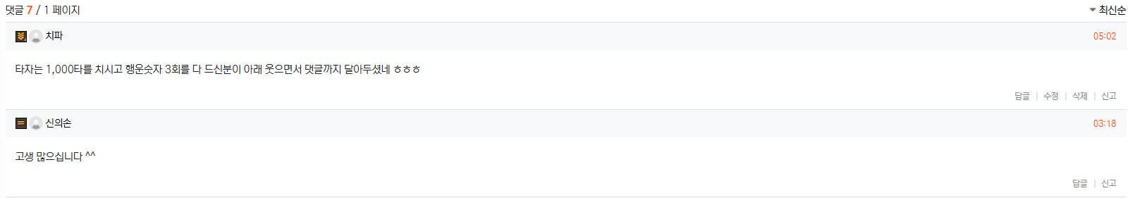 치파님의 댓글 치파쪽지보내기 회원정보 게시글 검색 댓글 검색쪽지보내기 회원정보 게시글 검색 댓글 검색 작성일 2025.10.12 05:02 타자는 1,000타를 치시고 행운숫자 3회를 다 드신분이 아래 웃으면서 댓글까지 달아두셨네 ㅎㅎㅎ 신고 타자는 1,000타를 치시고 행운숫자 3회를 다 드신분이 아래 웃으면서 댓글까지 달아두셨네 ㅎㅎㅎ