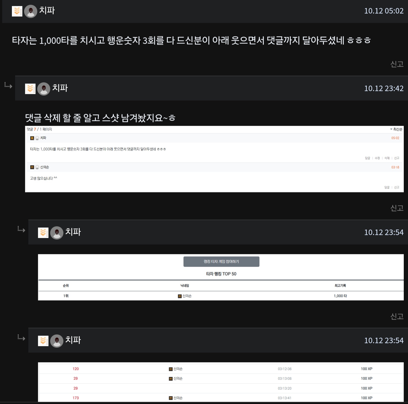 치파님의 댓글 치파쪽지보내기 회원정보 게시글 검색 댓글 검색쪽지보내기 회원정보 게시글 검색 댓글 검색 작성일 00:15 00시00분01초 출첵하고 바로 00시00분02초 5초간격 숫자뽑기 3회적중 타자 1000타치고 신고글에 고생많다고 댓글 달았었죠 요즘은 497타?정도로 1등찍어놨더라고요 벌써 중사라니 오늘 꼭 점수 초기화 되시길~ 신고 [https://remiz.co.kr/data/editor/2510/cmt_2077592331_DRF4S7fs_a9167f8f424df3e5a027e309bf8f89d42c0144c0.jpg] 00시00분01초 출첵하고 바로 00시00분02초 5초간격 숫자뽑기 3회적중 [https://remiz.co.kr/data/editor/2510/cmt_2077592331_MSpyIome_99ddaaa0fb1e6c283ee5ac8d61f3a944e0048779.jpg] 타자 1000타치고 신고글에 고생많다고 댓글 달았었죠 요즘은 497타?정도로 1등찍어놨더라고요 벌써 중사라니 오늘 꼭 점수 초기화 되시길~