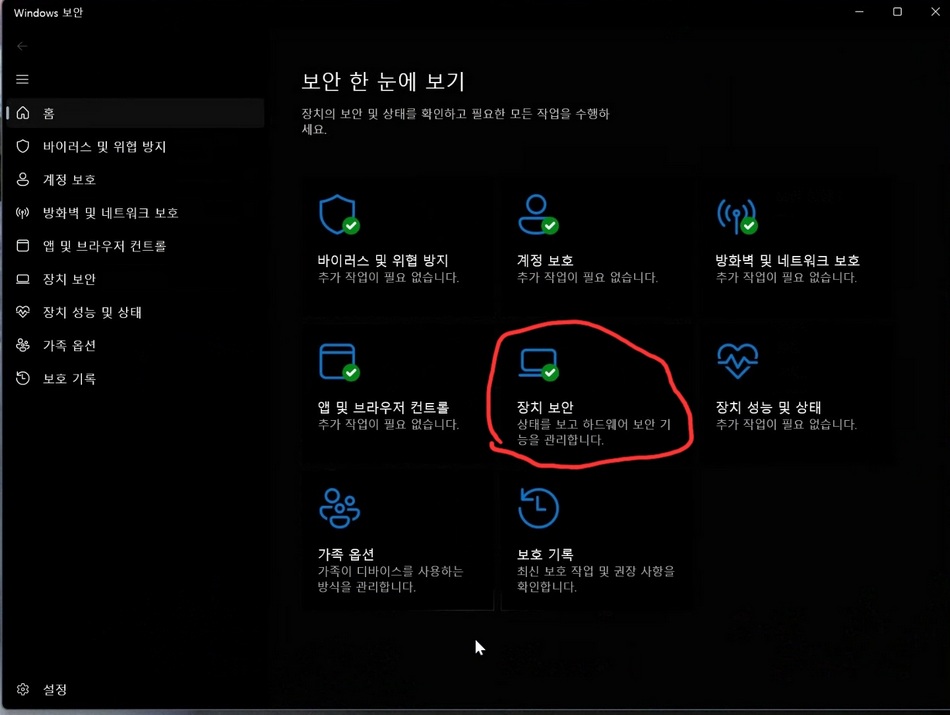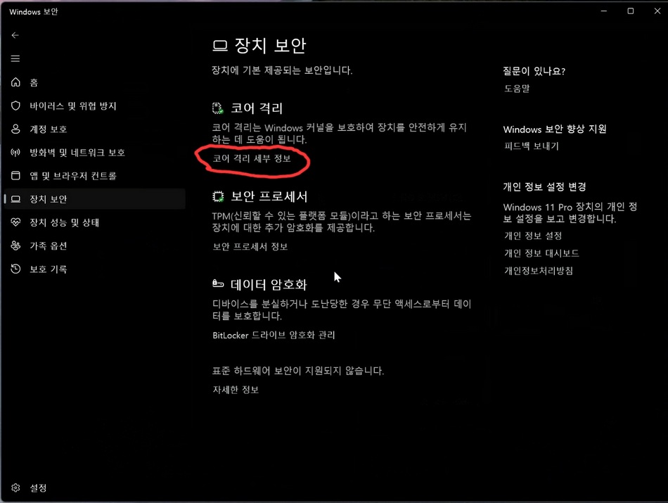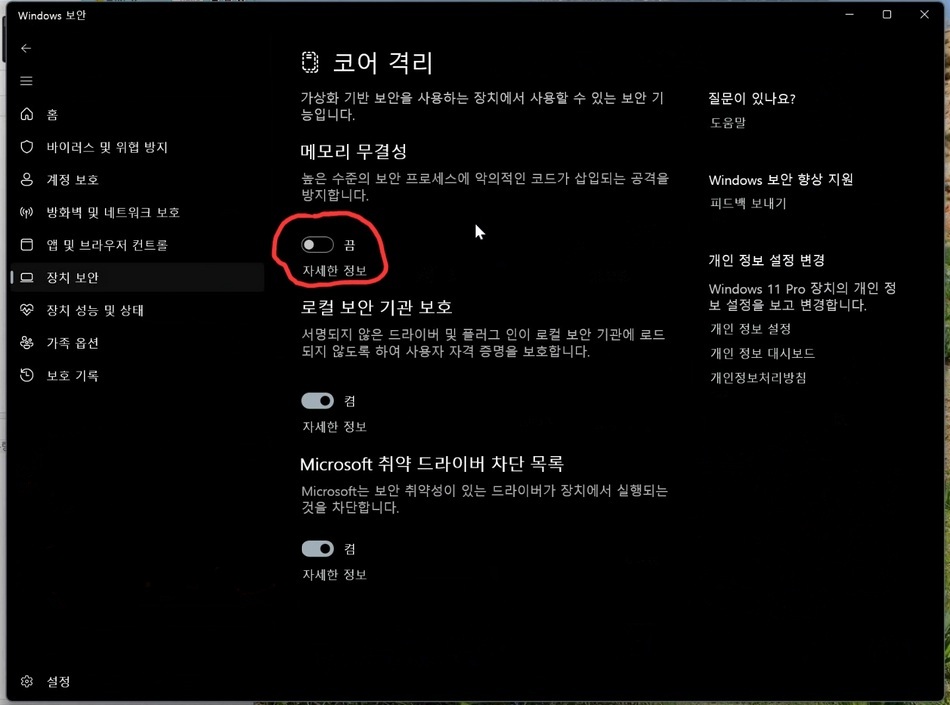 작업표시줄 우측 트레이에서 ①파란색 방패를 눌러 (windows보안)을 실행 ~ ②장치보안 선택 ~ ③"코어격리"의 세부정보 클릭 ~ ④"메모리무결성" 아래의 체크를 해제하고 재부팅!